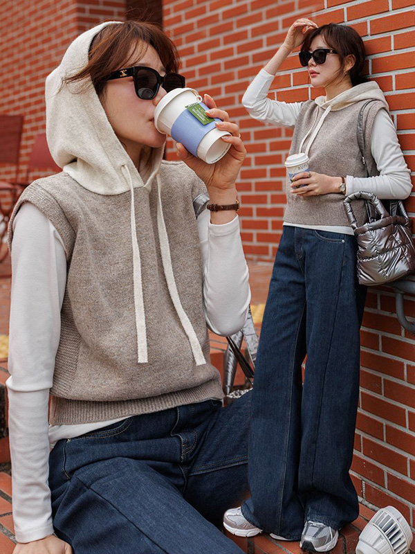 【C55922】韓國JAM 撞色連帽背心-素面抽繩連帽羊毛短版無袖針織上衣★★