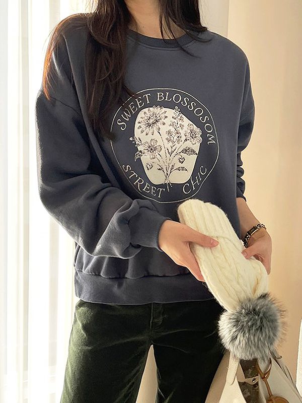 【C55923】韓國MNR 絨布花花大學T-燙印印花內刷毛圓領長袖上衣★★
