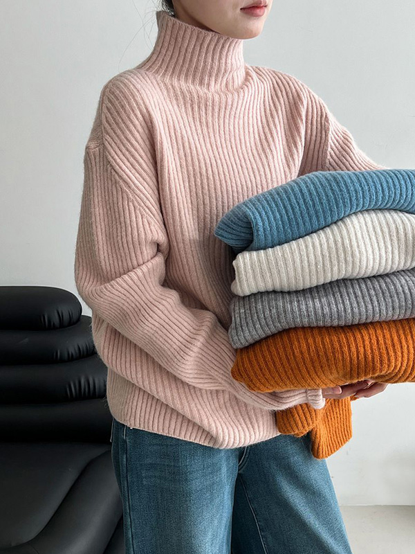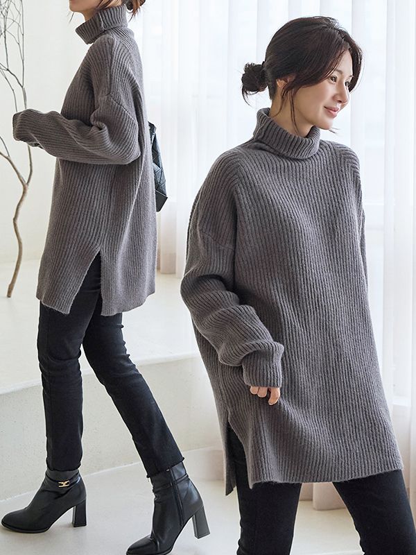 【C55924】韓國BLG 長版坑條針織衫-素面反摺高領側開衩寬鬆長袖上衣