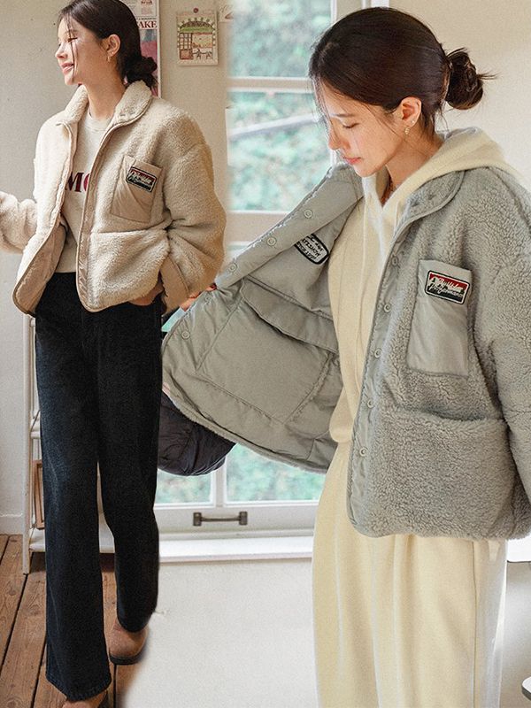 【C55732】韓國CAN 雙面穿毛毛外套-羔羊毛寬鬆立領印花布標長袖夾克_影片★★