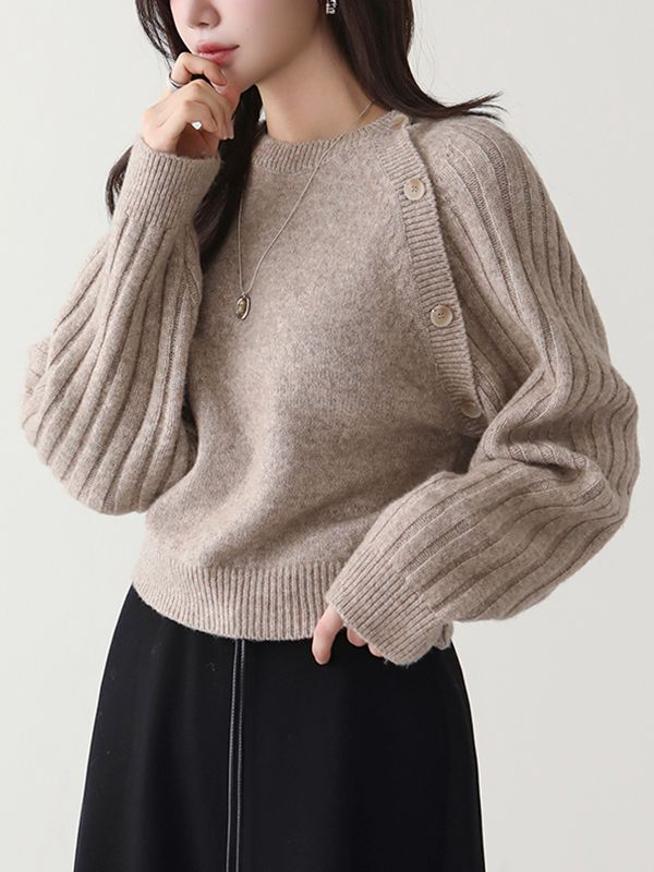 【C55926】韓國PPI 斜邊排釦針織衫-素面混羊毛連肩寬袖短版長袖上衣★★