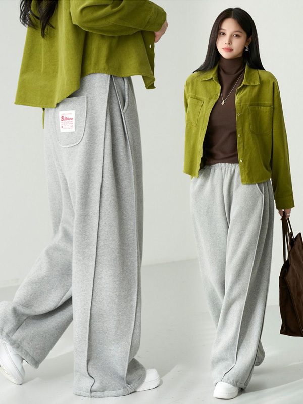 【C55927】韓國PPI 反車線寬褲-後口袋字母布標內刷毛褲腳收繩長褲★★