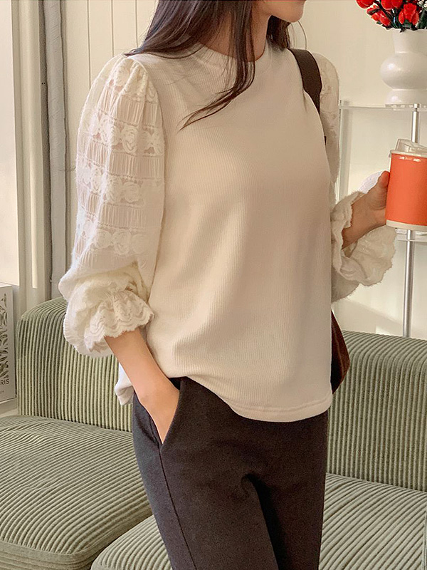 【C55929】韓國PUR 毛蕾絲長袖上衣-素面透膚雕花公主袖拼接針織衫