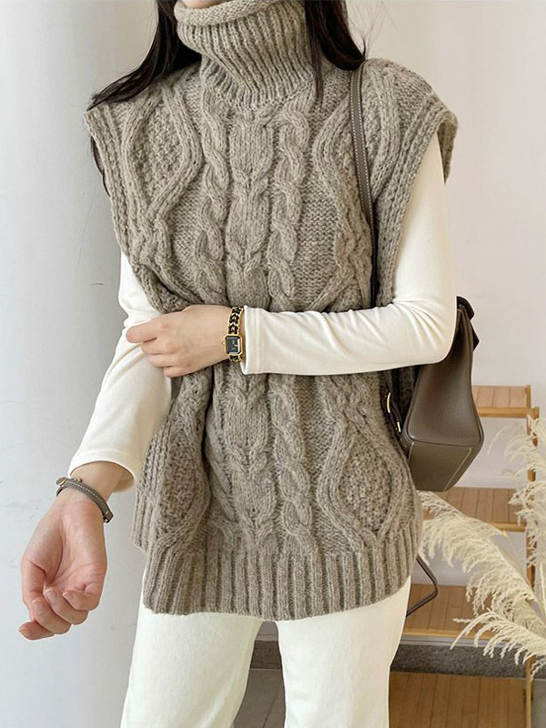 【C55932】韓國MNR 立領針織背心-捲邊高領立體麻花編織無袖素面上衣