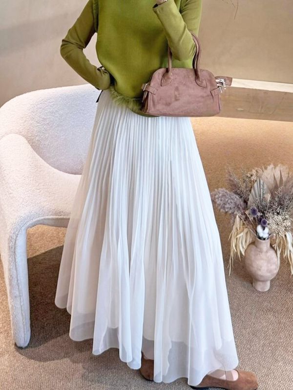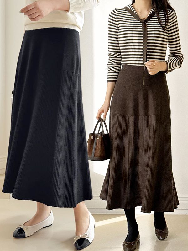 【C55933】韓國MAZ 傘狀針織裙-素面彈性坑條全腰鬆緊A字長裙