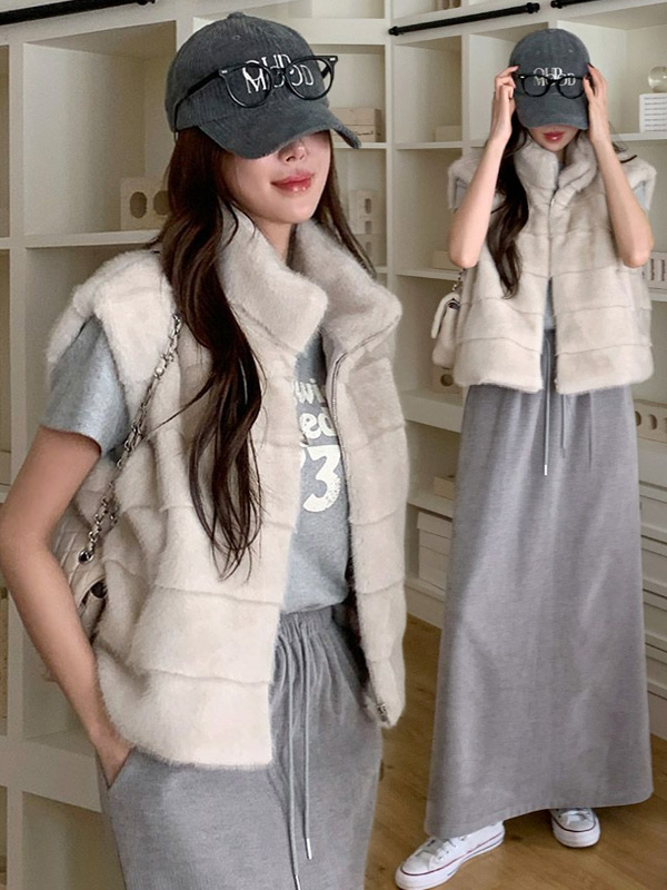 【C55936】韓國TMO 水貂毛立領背心-素面婚禮寬肩無袖短版拉鍊外套