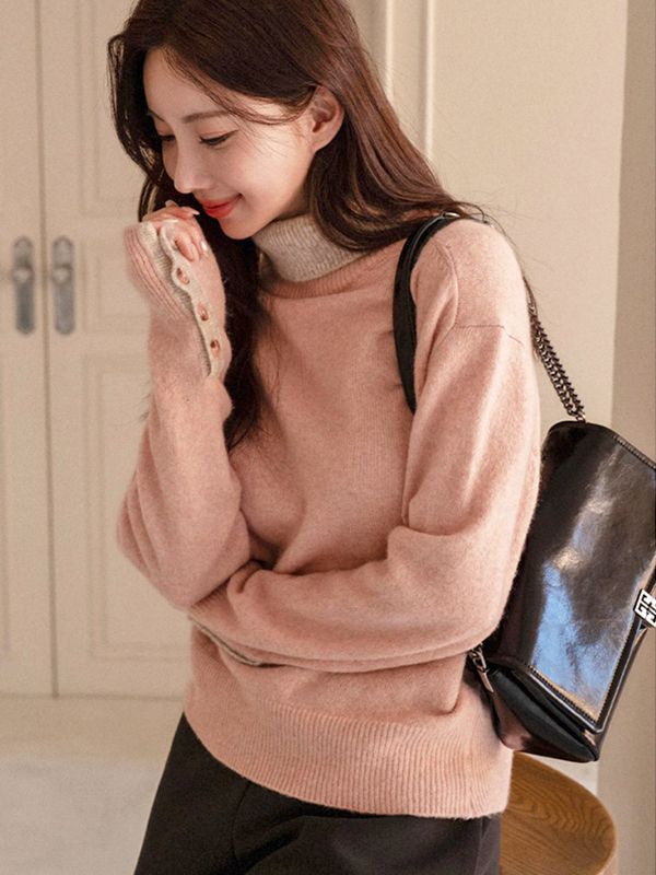 【C55939】韓國CAN 雙層立領針織衫-假兩件拼接素面好氣色長袖上衣