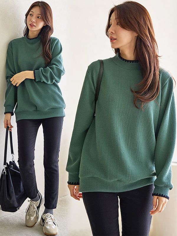 ★限時24H優惠★【C55942】韓國BLG 坑條立領上衣-好氣色寬鬆長版素面撞色滾邊長袖