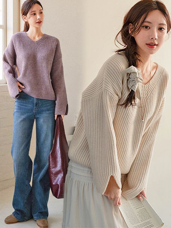 ★限時24H優惠★【C55943】韓國CAN 開衩寬袖針織衫-素面好氣色V領寬鬆連肩長袖上衣