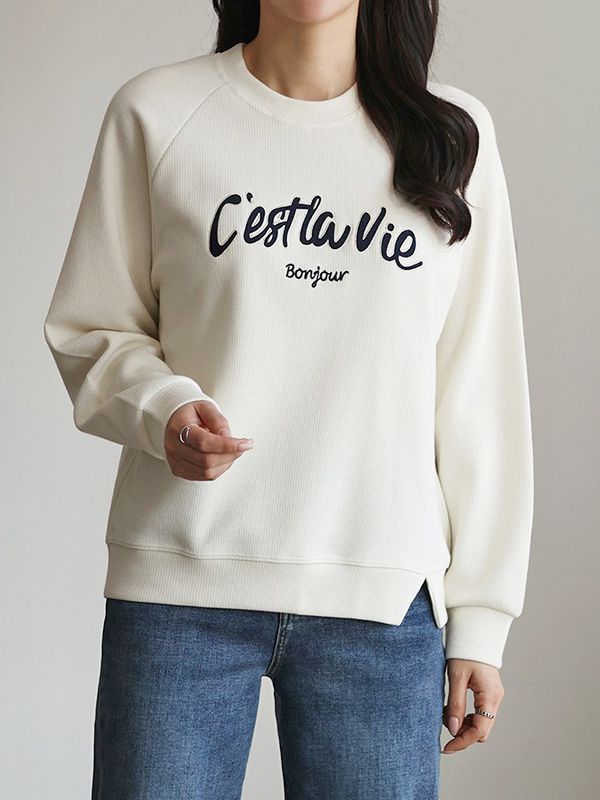 ★限時24H優惠★【C55944】韓國SNY 刺繡字母上衣-圓領連肩袖下襬開衩切口長袖T恤
