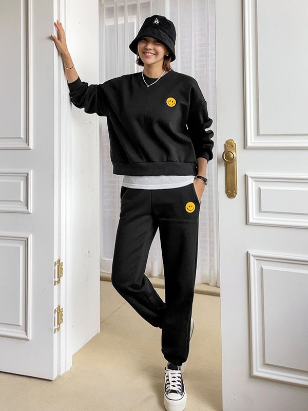 ★限時24H優惠★【C55945】韓國JAM 微笑貼布套裝-笑臉印花內刷毛長袖上衣+束口長褲