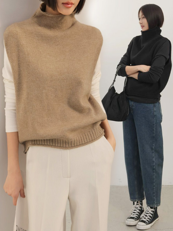 ★限時24H優惠★【C55947】韓國ABS 小包肩立領背心-素面捲邊高領寬肩無袖針織上衣