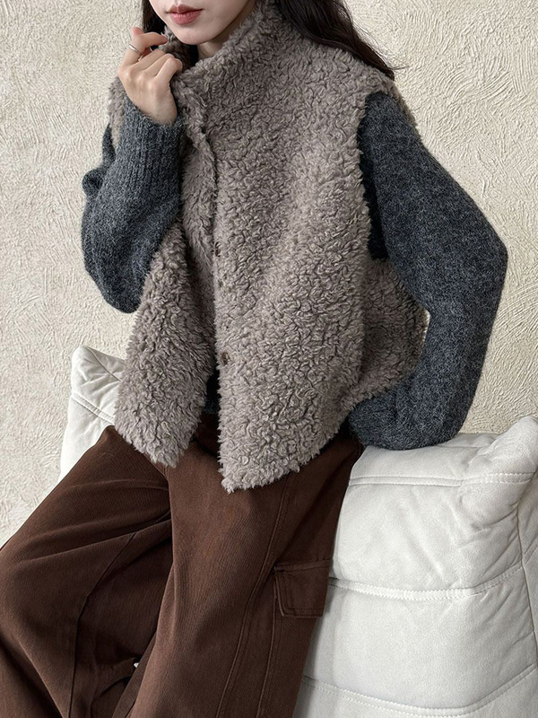 【C60058】品牌 混羊毛背心外套-素面羔羊毛立領寬鬆無袖夾克★★