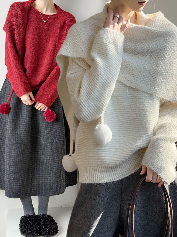 【C60061】品牌 毛球針織衫套裝-U領素面長袖上衣+三角球球披肩★★