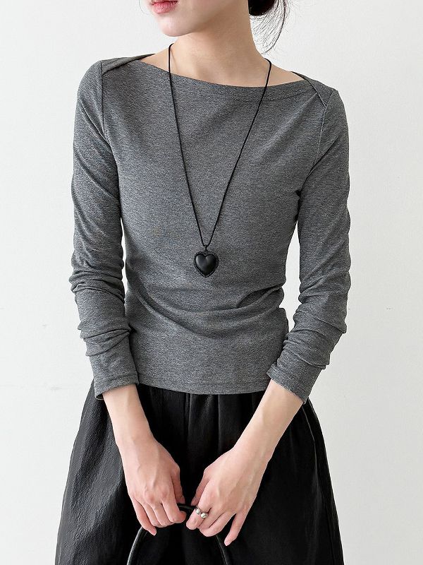 【C60063】品牌 一字領素面上衣-交叉肩袖合身內搭長袖短版T恤★★