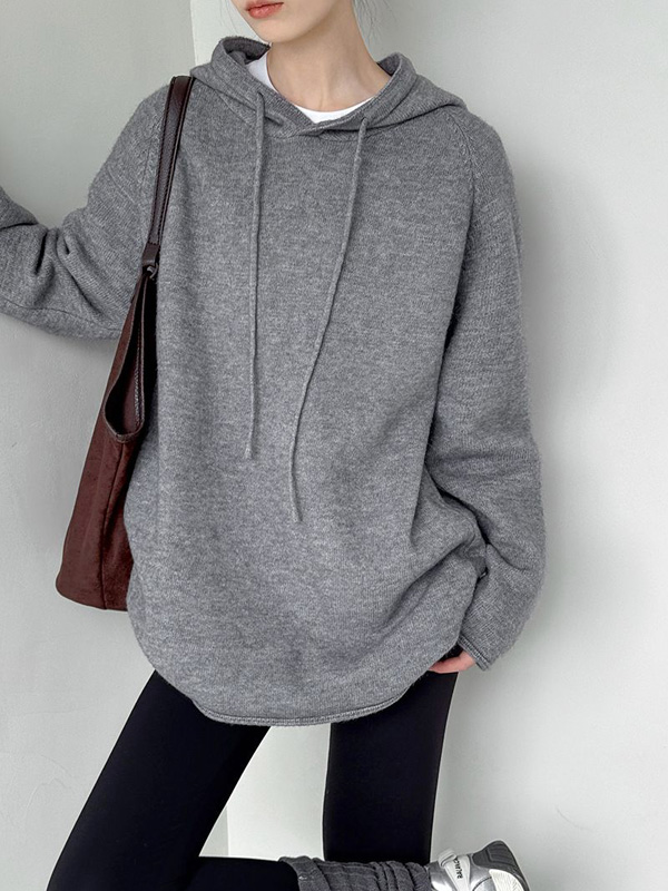 【C60091】品牌 連帽針織衫-素面寬鬆長版抽繩連帽長袖上衣★★