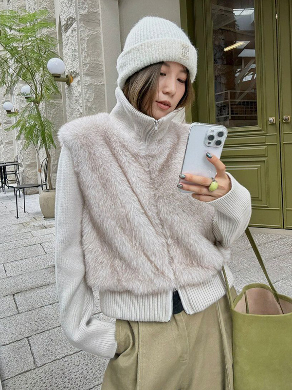 【C73722】品牌 假兩件毛毛外套-素面針織拼接高領雙開拉鍊長袖★★