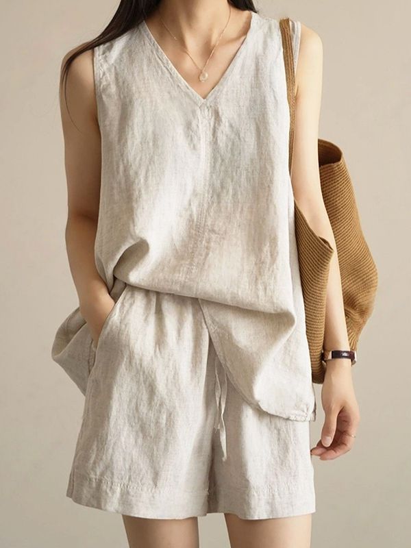 【C54812】韓國HLO 亞麻背心套裝-V領傘狀無袖上衣+素面抽繩腰短褲