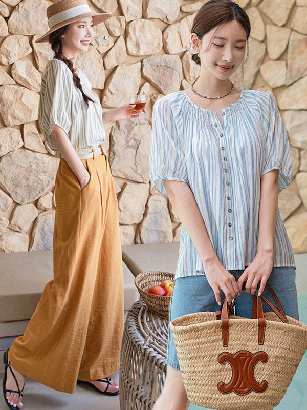 【C52574】韓國CFX 條紋V領襯衫-字母抓褶收腰寬鬆短袖上衣_影片★★