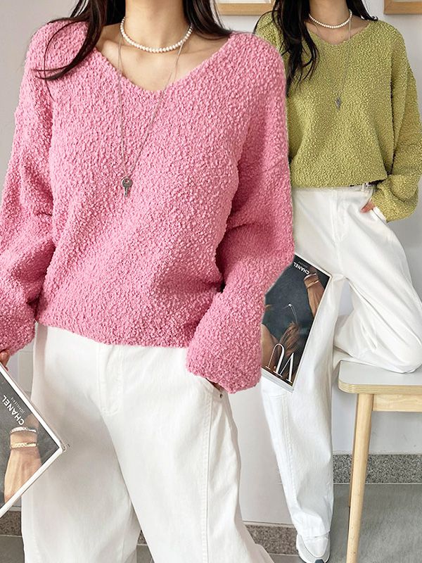 ★限時24H優惠★【C55997】韓國MNR 球球毛線針織衫-素面好氣色V領落肩長袖上衣