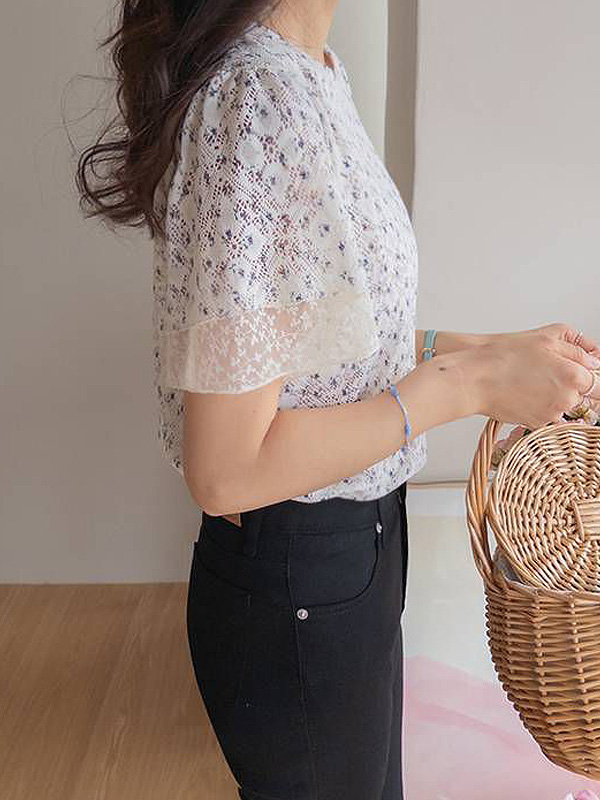 【C55049】韓國LEE 蕾絲碎花上衣-縷空雕花圓領透膚滾邊印花短袖T恤