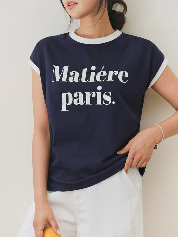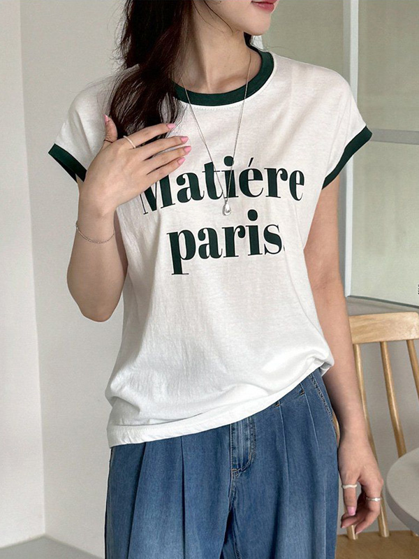 【C55101】韓國DLY 撞色滾邊T恤-圓領跳色粗體字母連肩短袖棉質上衣