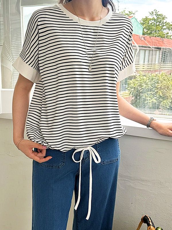 【C55069】韓國DLY 條紋連肩袖T恤-滾邊圓領寬鬆抽繩收腰短袖上衣★★