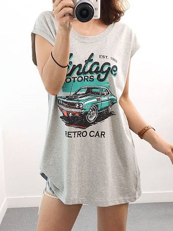 【C55091】韓國MIS 復古汽車T恤-寬鬆長版U領字母印花包肩短袖上衣★★