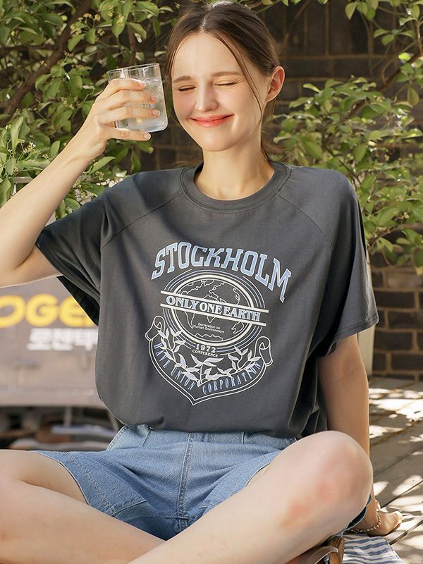【C55124】韓國MID 地圖字母T恤-圓領連肩袖1972印花短袖上衣