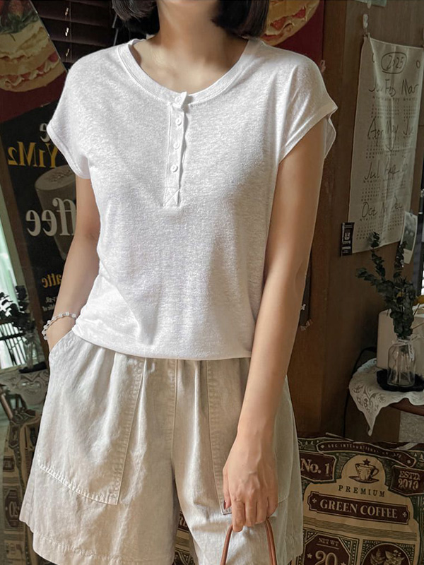 【C55299】韓國MAZ 混亞麻包肩上衣-素面半開襟圓領輕薄短袖T恤