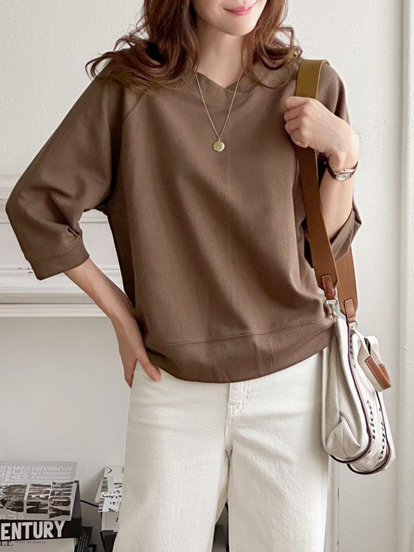 【C52063】韓國AAM 長版七分袖上衣-寬鬆素面側開衩好氣色落肩T恤★★