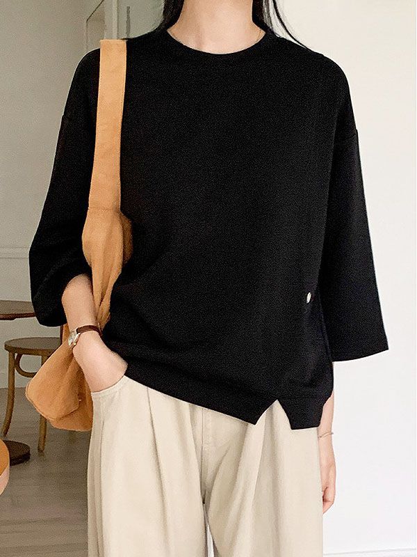 【C55463】韓國SNY 前襬雙衩T恤-素面好氣色圓領連肩寬袖七分袖上衣★★