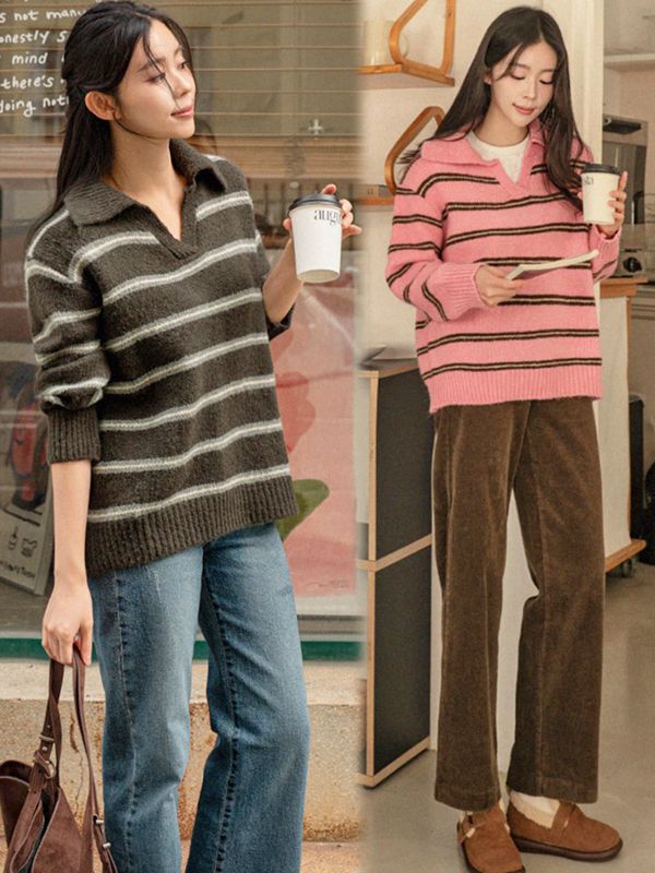 【C55836】韓國CAN 翻領條紋針織衫-寬鬆好氣色POLO領長袖上衣★★