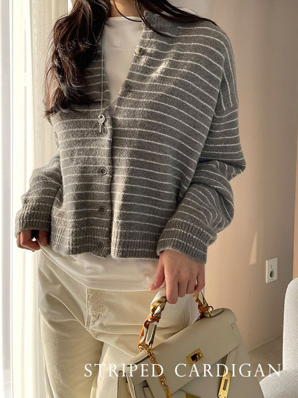 【C55897】韓國MNR 細條紋針織衫-圓領開襟排釦寬鬆短版長袖上衣外套