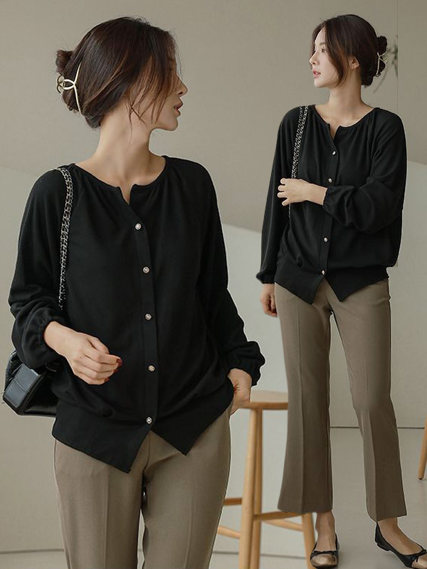 【C55707】韓國BLG 抓皺圓領上衣-素面寬鬆後襬束口假排釦連肩長袖