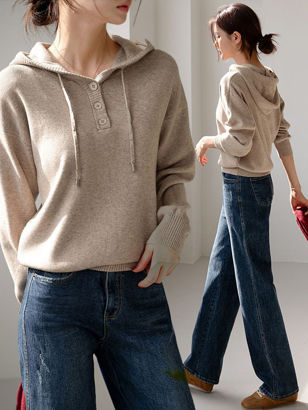 【C55713】韓國CAN 抽繩連帽針織衫-半開襟排釦領素面落肩長袖上衣