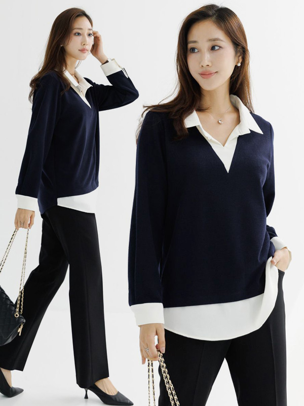 【C55697】韓國SNY 牛仔拼接針織衫-假兩件襯衫領素面長袖上衣外套★★