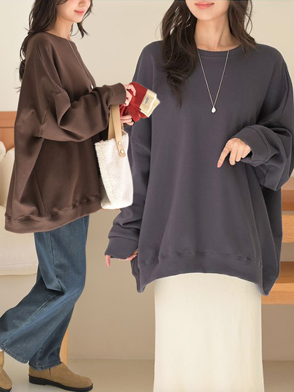 【C55738】韓國DLY 素面內絨毛上衣-寬鬆長版圓領飛鼠袖長袖大學T