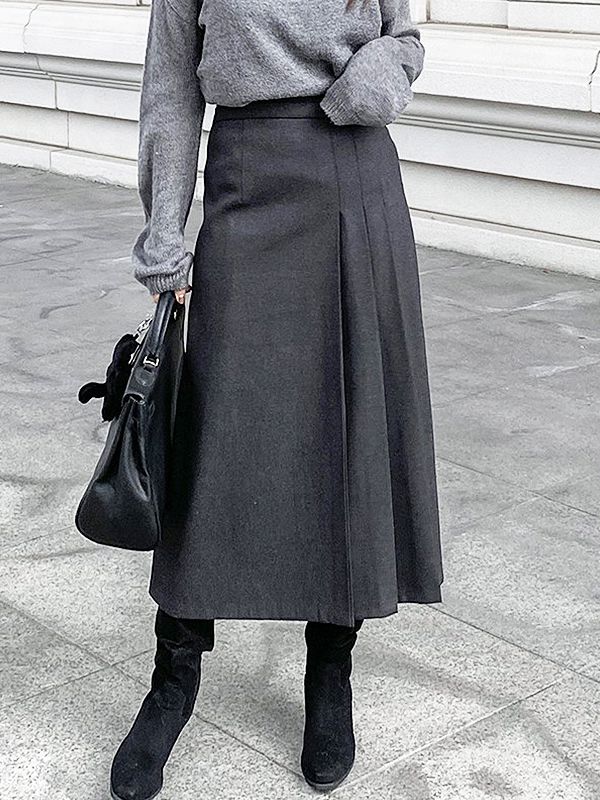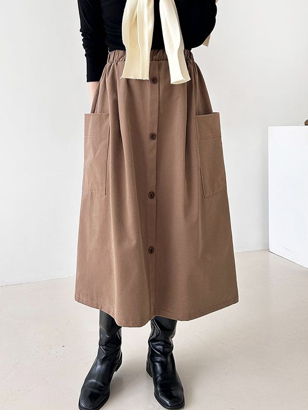 【C53410】韓國CCA 內磨毛A字裙-素面寬鬆多尺寸拉鍊鈕釦後開衩長裙★★