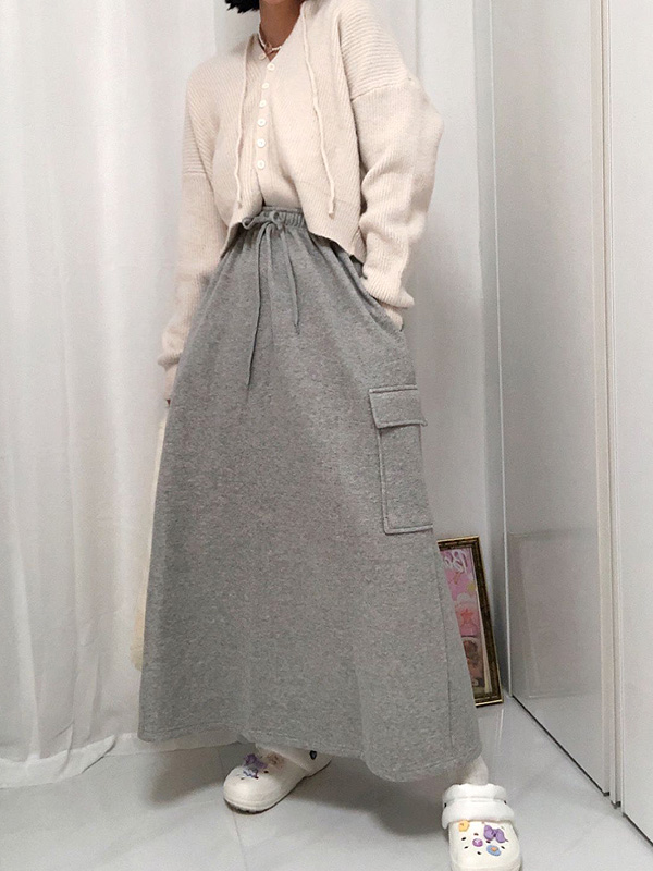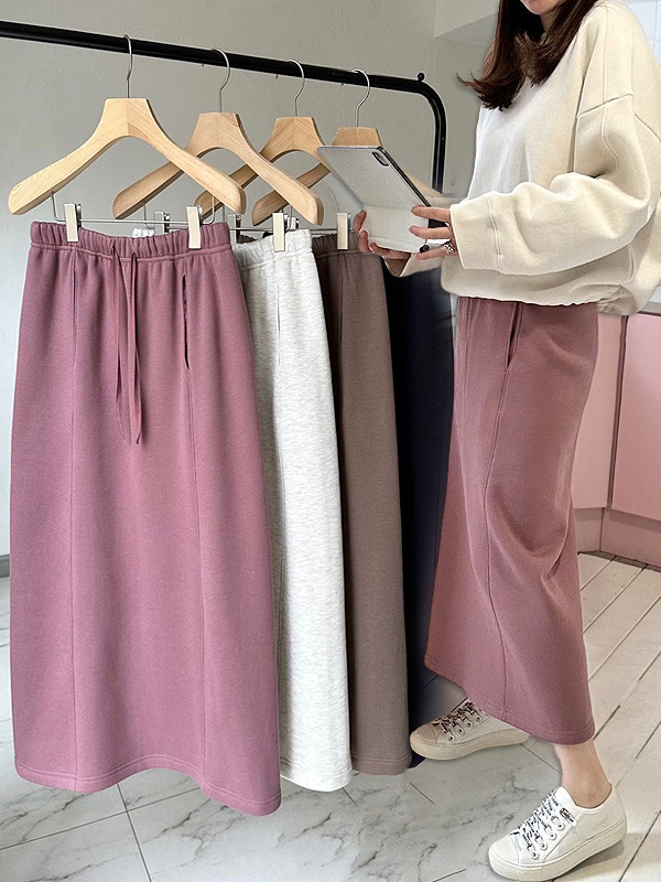 【C59163】韓國PUR 休閒刷毛長裙-保暖素面後高衩雙口袋抽繩鬆緊直筒裙★★