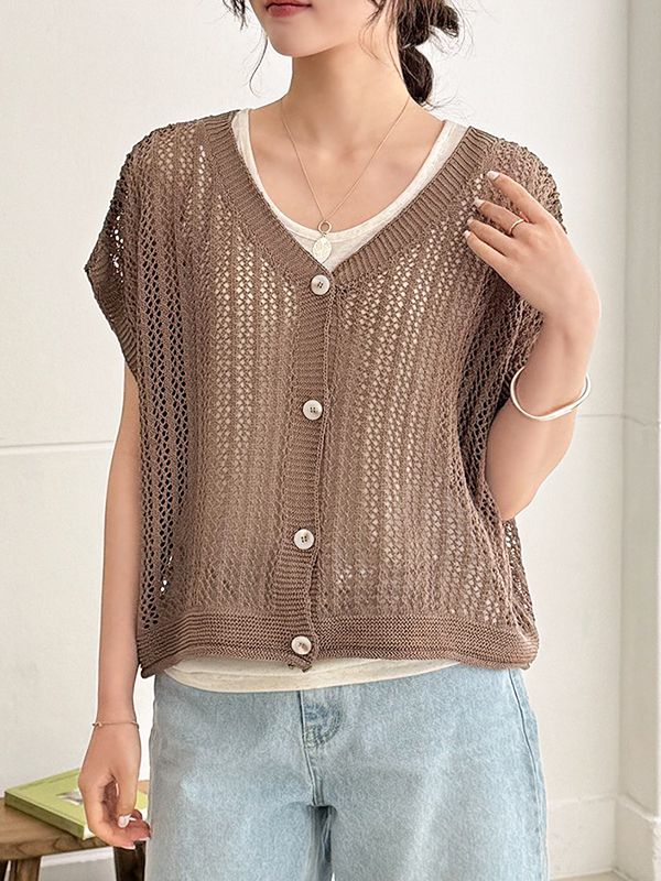 【C54989】韓國DLY 洞洞針織外套-渡假素面V領大鈕釦寬鬆短袖罩衫★★