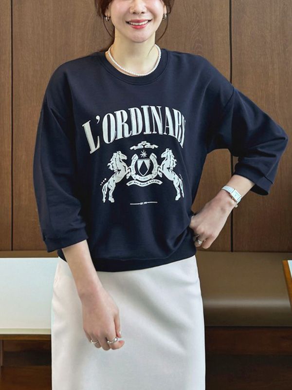 【C56032】韓國JAM 馬兒徽章大學T-個性字母圓領七分寬袖印花上衣