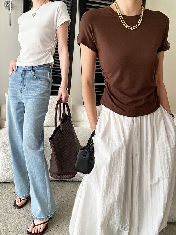 【C60175】品牌 抓褶收腰素T-素面合身內搭圓領短版包肩短袖上衣
