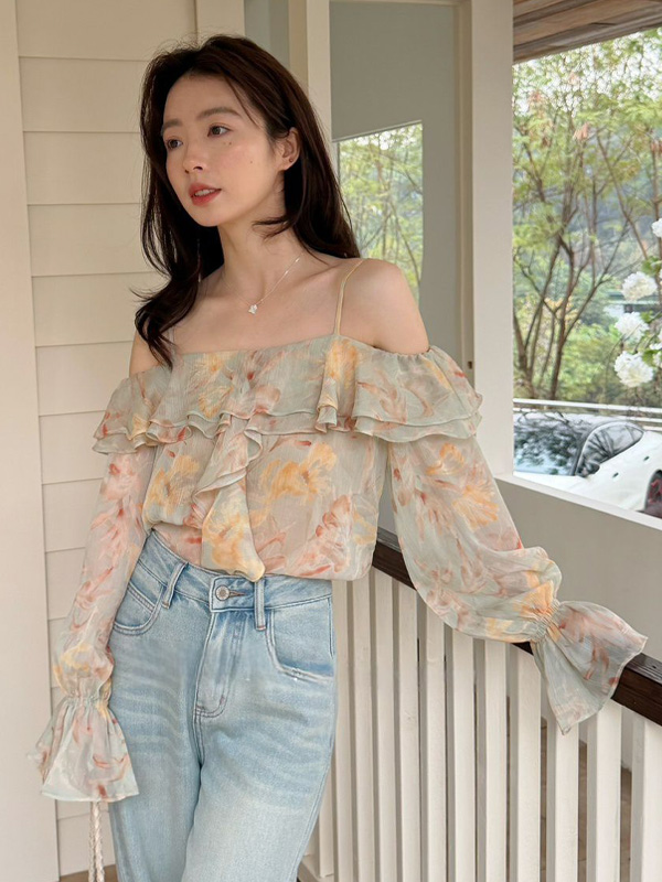 【C73806】品牌 印花雪紡衫-荷葉邊一字領細肩吊帶花苞長袖上衣