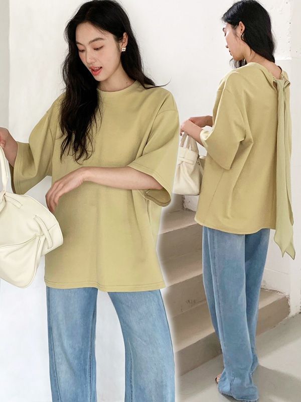 ★限時24H優惠★【C73815】品牌 後領綁結大T恤-素面圓領織帶造型寬鬆七分袖上衣