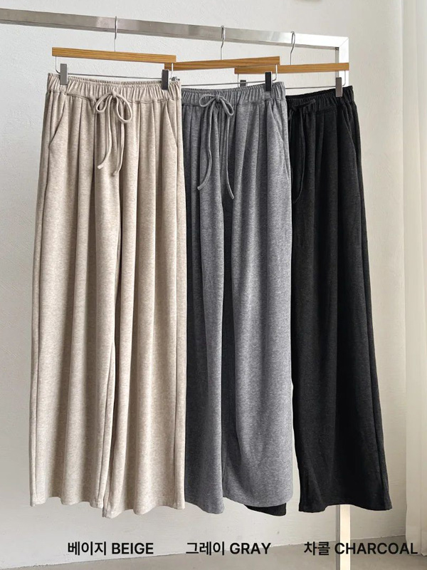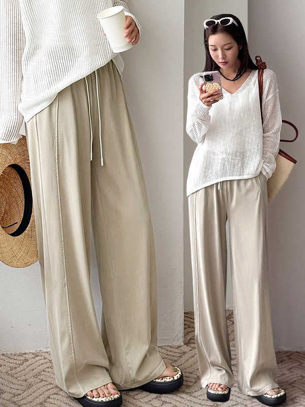 【C55186】韓國COC 坑條落地褲-素面抽繩收腰柔軟垂墜感直筒長褲★★