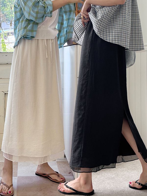【C54959】韓國MBL 雙層直筒紗裙-婚禮素面好氣色抽繩收腰後開衩長裙_影片★★