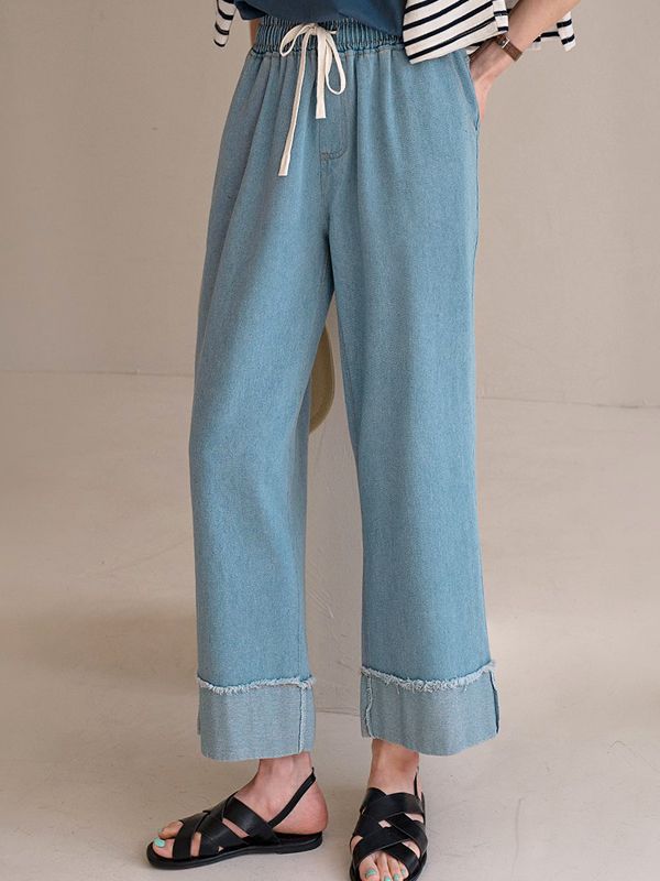 【C54984】韓國CAN 流蘇捲邊牛仔褲-素面抽繩腰反摺褲腳直筒九分褲★★