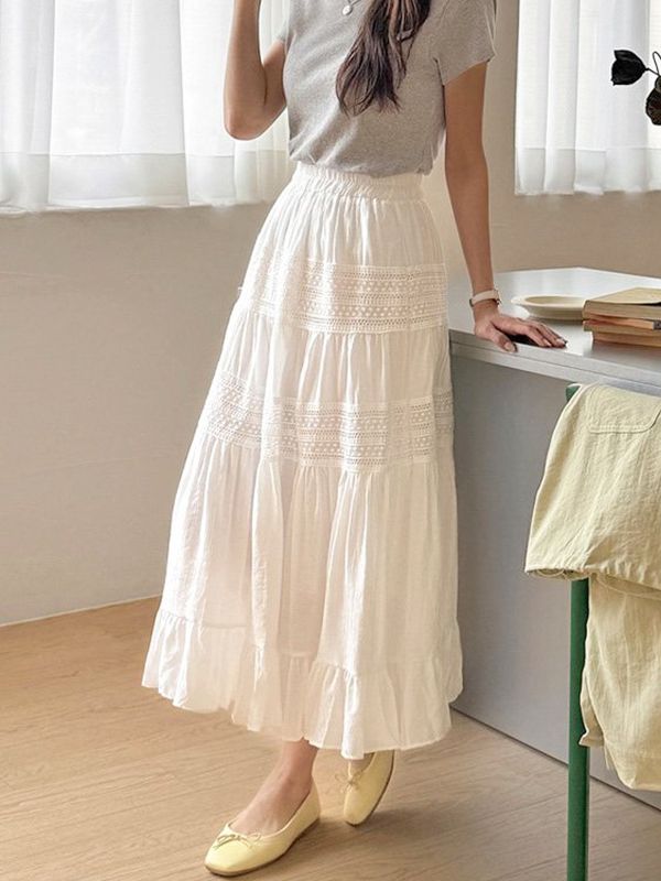 【C55109】韓國NAK 縷空雕花長裙-素面全腰鬆緊渡假波浪花邊蛋糕裙★★