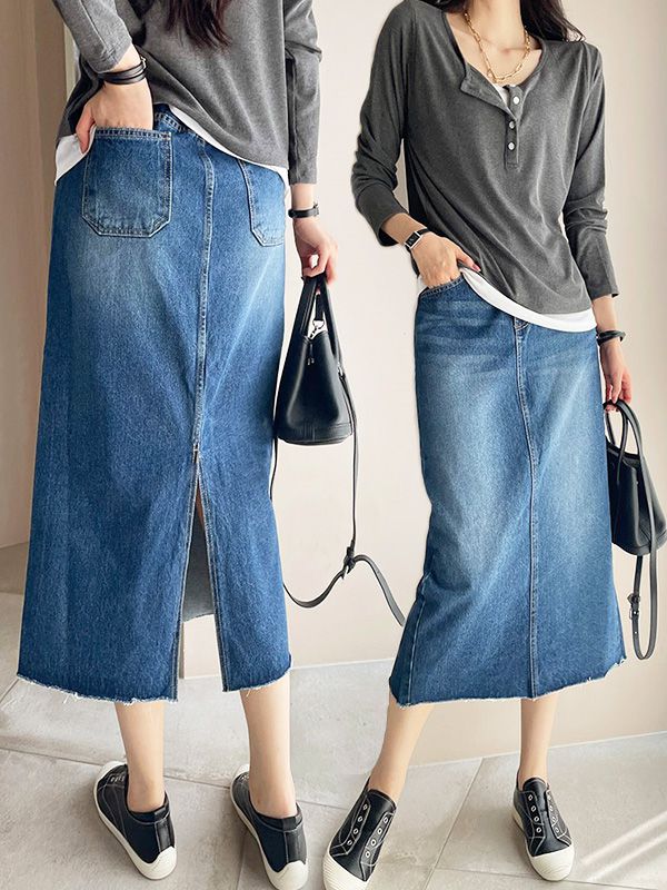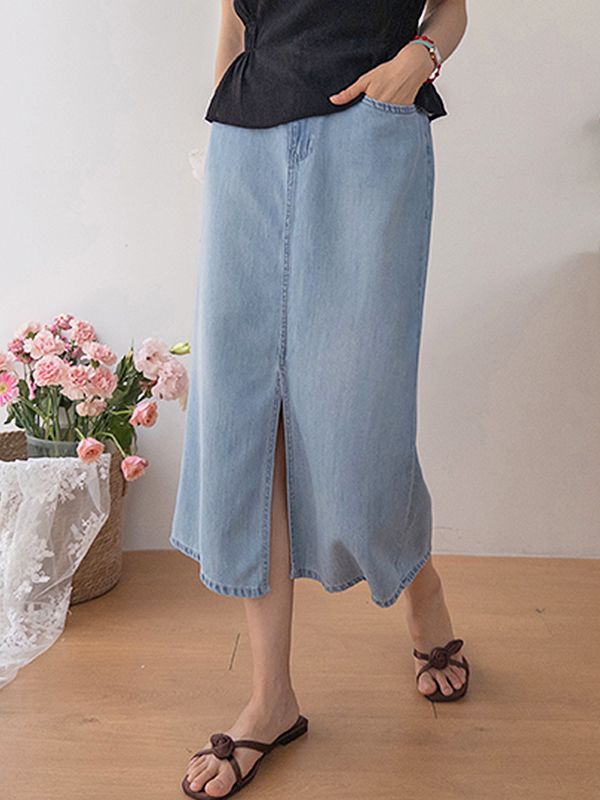 【C55004】韓國LEE 輕薄牛仔裙-素面柔軟水洗棉後腰鬆緊前開衩裙子★★